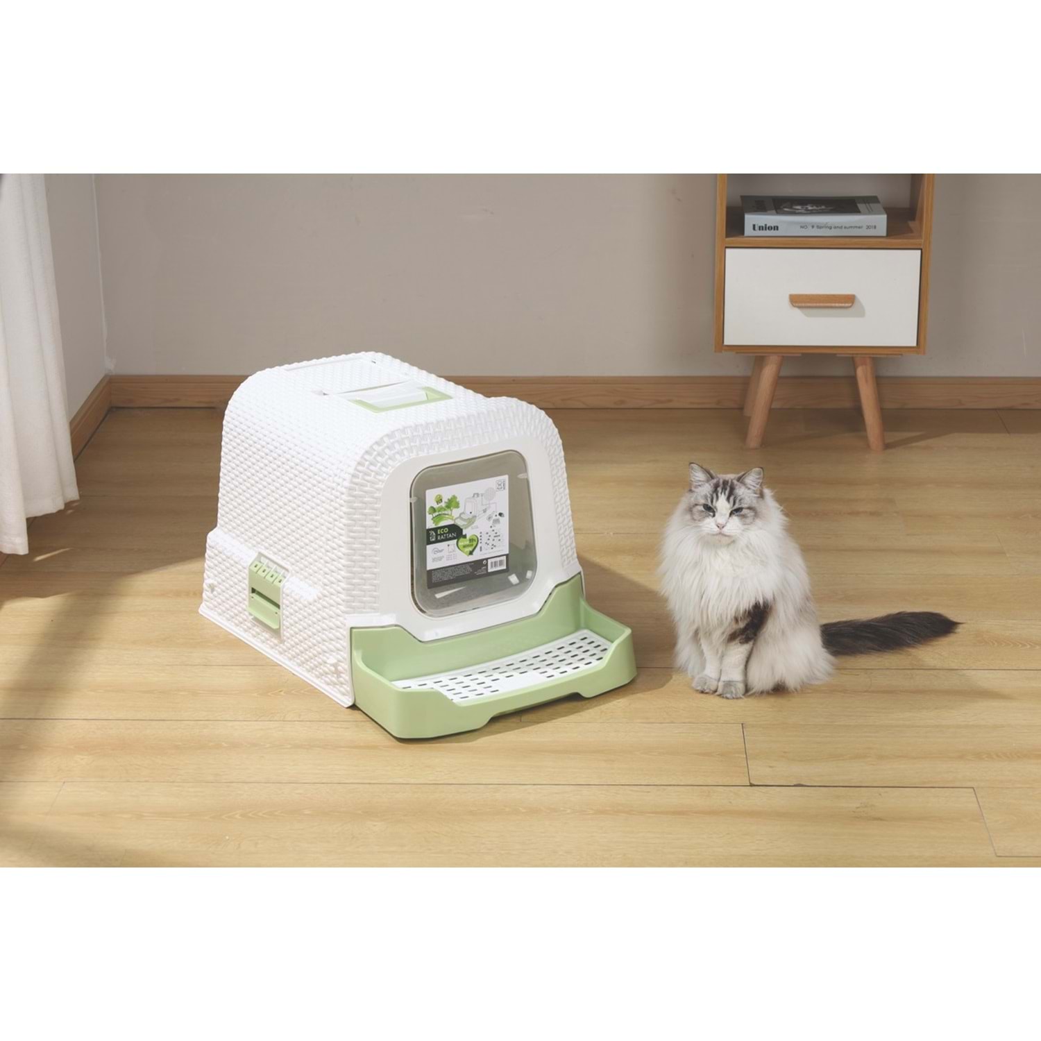 M-PETS ECO RATTAN KAPALI KEDİ TUVALETİ WHITE/GREEN (69 x 42 x 41 CM)