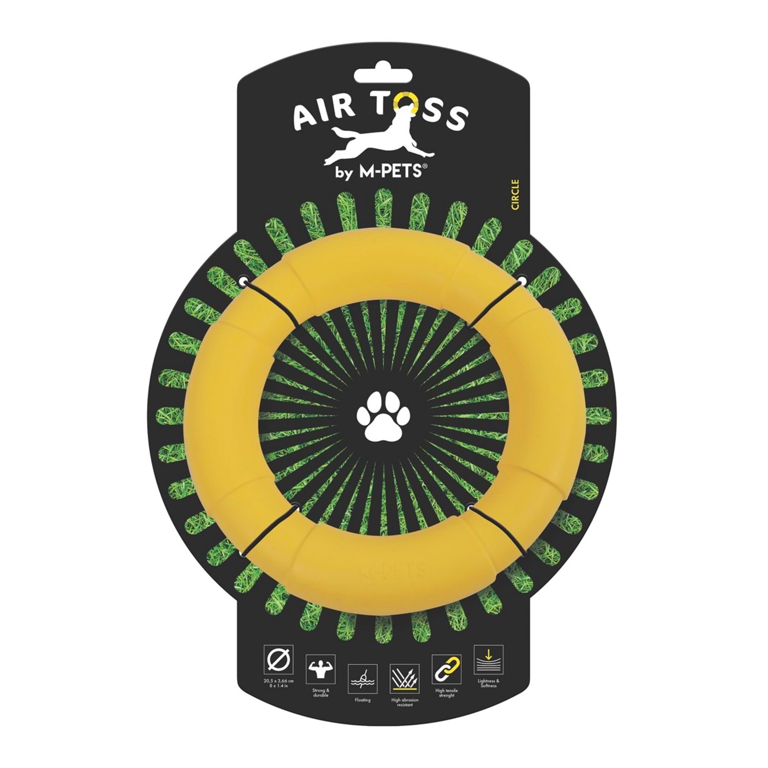 M-PETS® AIR TOSS Circle, iç ve dış mekanlarda fırlatma oyunları için özel olarak tasarlanmıştır. Süper hafif malzemesi sayesinde kolayca fırlatılabilir, su yüzeyinde batmadan yüzebilir. Sarı rengiyle dikkat çeken bu dayanıklı oyuncak, köpeğinizin hem fiziksel hem zihinsel enerjisini keyifle harcamasına yardımcı olur.