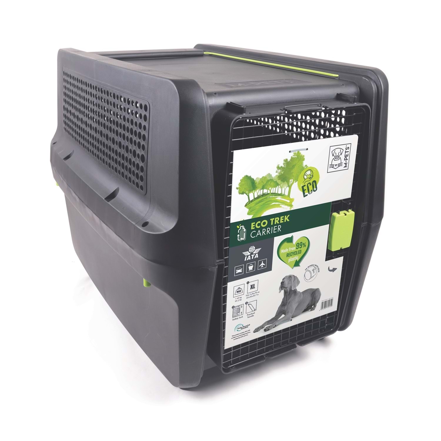 M-PETS ECO TREK taşıma çantası, %100 geri dönüştürülmüş plastikten üretilmiş çevre dostu yapısıyla sağlamlık ve sürdürülebilirliği bir araya getirir. XL beden modeli, IATA standartlarına uygundur ve çok büyük ırk evcil hayvanlar için özel olarak tasarlanmıştır. Ön kısmında güvenlik vidalı metal kapı, üst taşıma sapı ve 4 adet tekerlek (2’si kilitlenebilir) sayesinde rahatça taşınabilir. Geniş iç hacmi ve tam hava dolaşımı sağlayan havalandırma sistemleriyle uzun yolculuklarda dahi konfor sağlar.