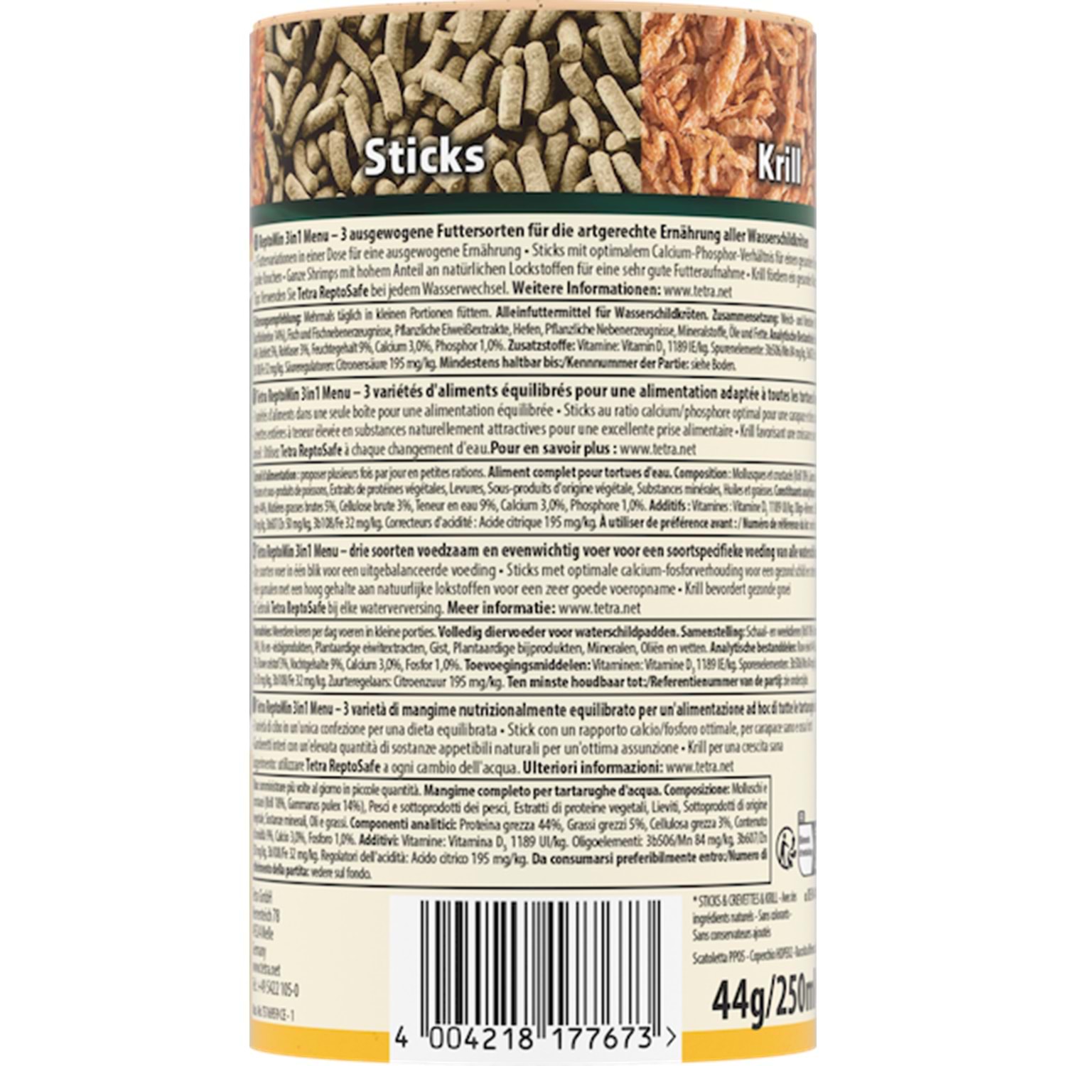 Tetra ReptoMin 3in1 Menu, su kaplumbağalarının türe uygun beslenmesi için özel olarak hazırlanmış üç farklı yem türünü bir araya getirir. Optimum kalsiyum-fosfor oranına sahip çubuklar güçlü kemik ve sağlıklı kabuk gelişimini destekler. Yüksek doğal cezbedici içeren bütün karidesler iştahla tüketilirken, mini kriller sağlıklı büyümeye katkı sağlar. Renklendirici ve ilave koruyucu içermeyen benzersiz tarif, kaplumbağaların bağışıklığını güçlendirir ve uzun ömürlü bir yaşam için destek sunar. Her su değişiminde Tetra AquaSafe kullanılması tavsiye edilir.